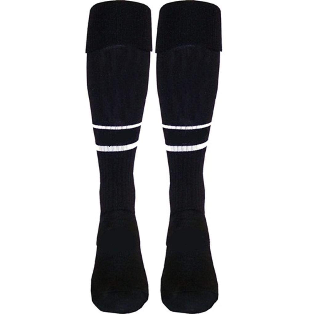 Performance soccer referee sock with strategic mesh inserts for exceptional comfort. Updated two striped design Compression in ankle and arch for exceptional support. Cushioned heel & toe for maximum comfort. 97 % Nylon 3% Spandex. Color: Black/White Stripe Intermediate 4.5-8.5