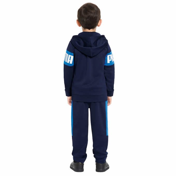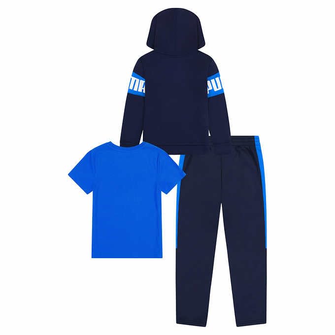 Elevate your child's athleisure wardrobe with the PUMA Kids' 3-piece Full Zip Hooded Jacket with Front Pockets Tech Fleece Set. This versatile set includes a full-zip hooded jacket with convenient front pockets, a short-sleeve tee featuring PUMA graphics, and a pull-on bottom (jogger or legging) with an elastic waistband. The jogger also has front pockets for added functionality. Crafted from high-quality materials like polyester, cotton, and spandex blends, this set offers comfort and durability. Available in vibrant colors like blue, black, pink, and purple, it's perfect for active kids. Whether hitting the playground or lounging at home, this PUMA set keeps your little one cozy and stylish.